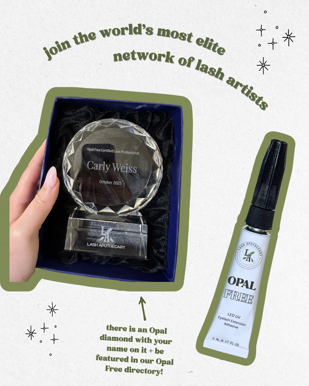 Upon graduation, you’ll earn the title Certified Opal Free Lash Professional — and your name will be proudly featured in our Opal Free Directory, a trusted resource for doctors and clients seeking the healthiest lash artists in the world.